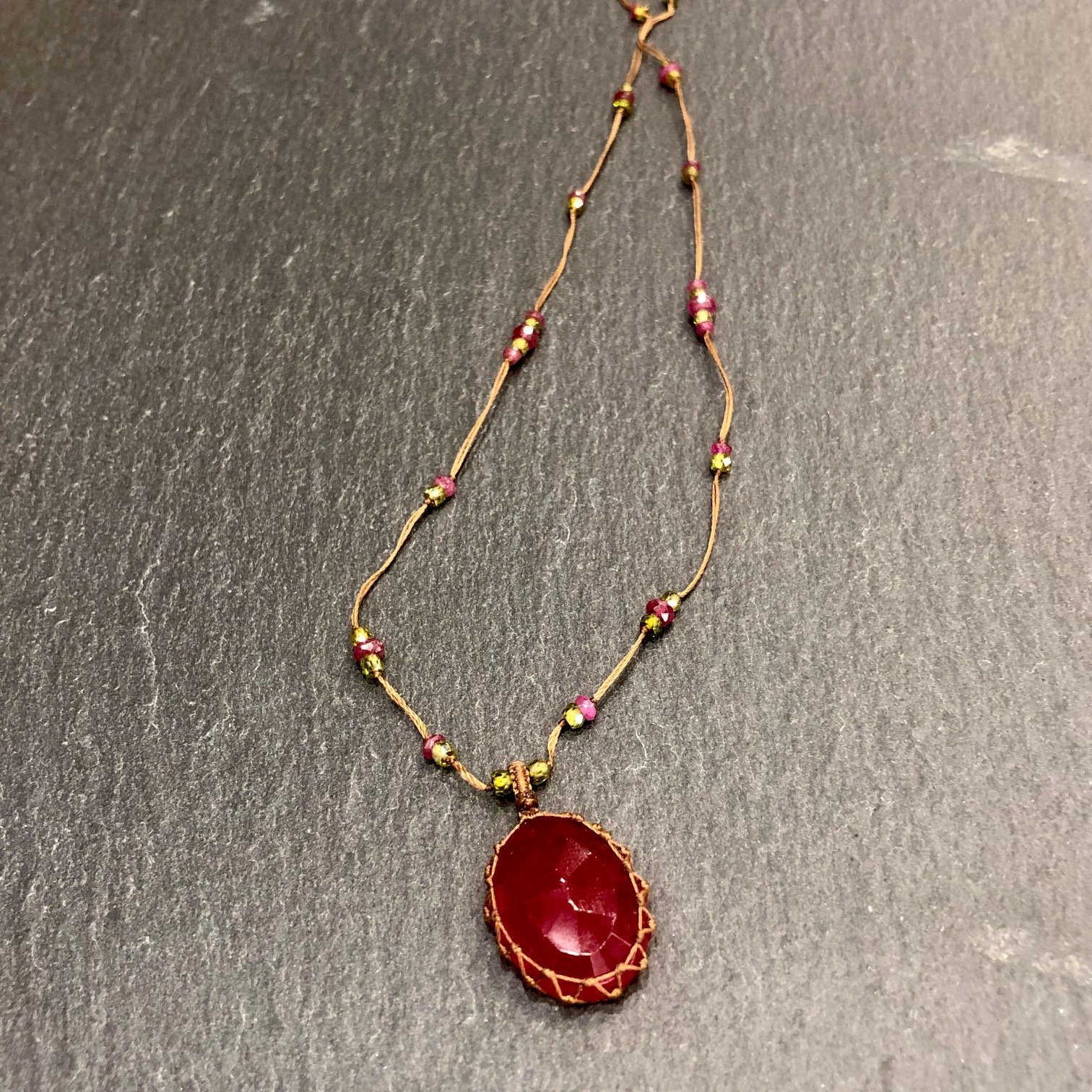 Collier court fil de soie beige foncé orné de pierres semi précieuses, pierre pendentif rubelite.
