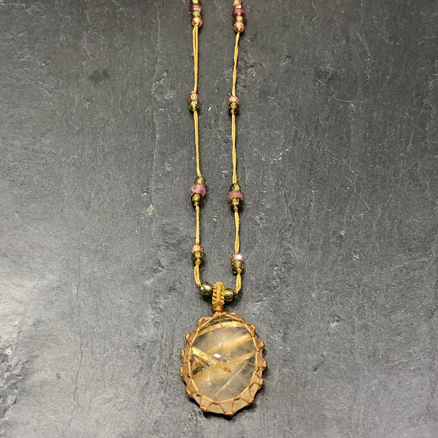 Collier court en fil de soie sable orné de pierres semi précieuses, pendentif en Rutile golden