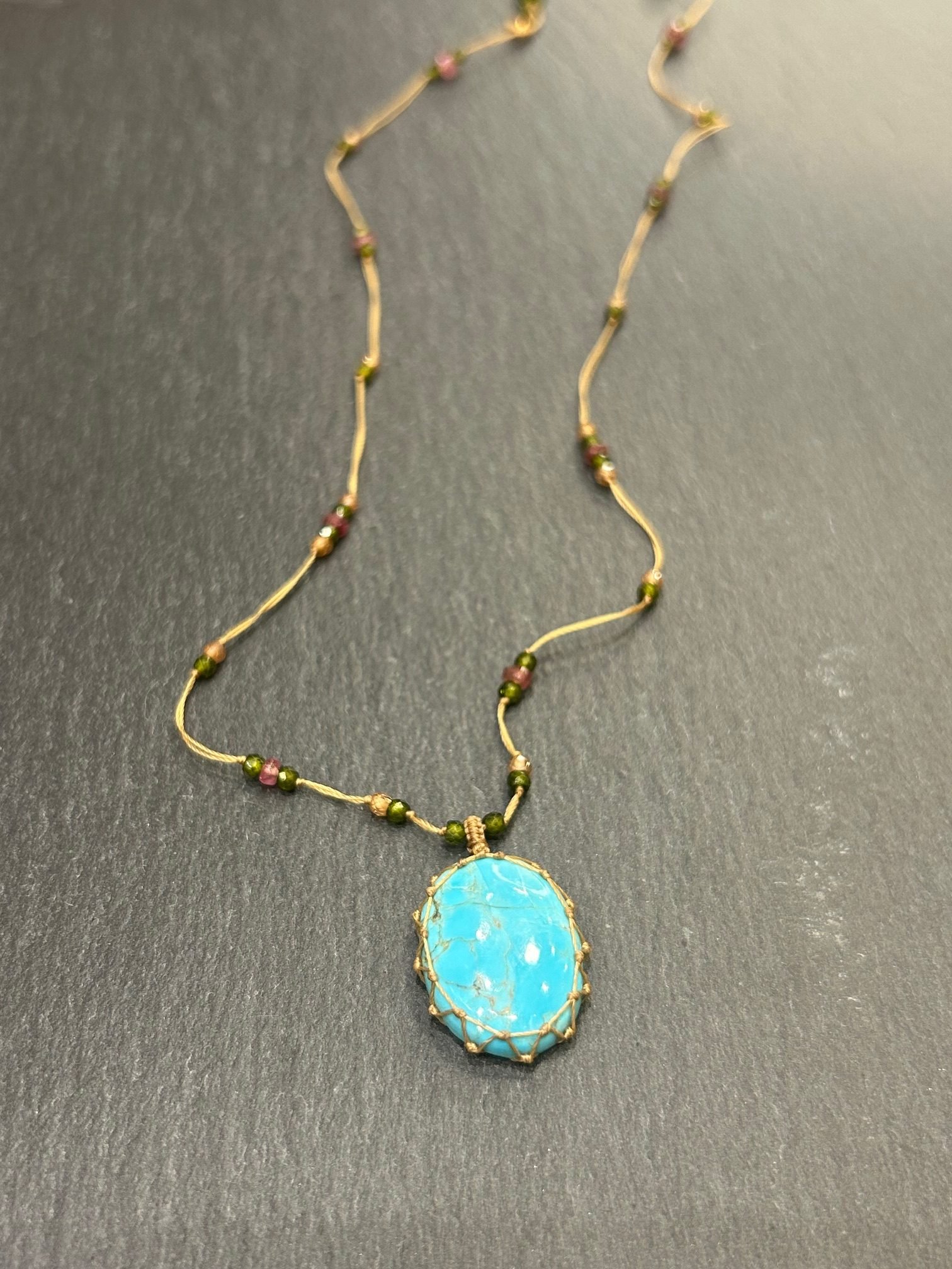 Collier court fil de soie sable orné de pierres semi précieuses, pierre pendentif turquoise.