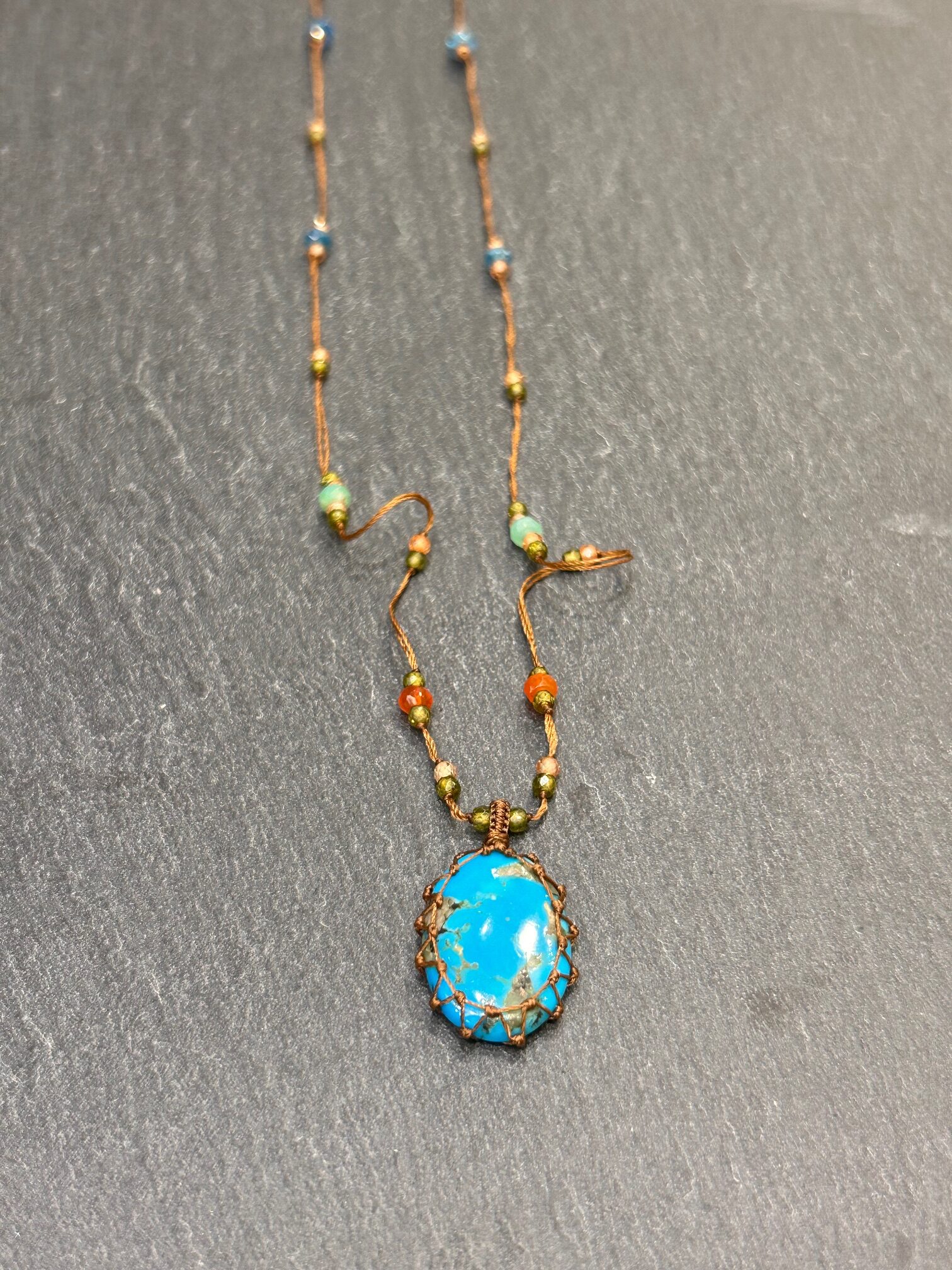 Le fil résistant couleur cognac structure l’ensemble avec sobriété. Il apporte une chaleur douce au bijou. De plus, les touches de tourmaline créent un contraste subtil et raffiné. Chaque pierre révèle une nuance délicate, jamais excessive. Par ailleurs, la turquoise centrale diffuse une énergie apaisante, profondément féminine.