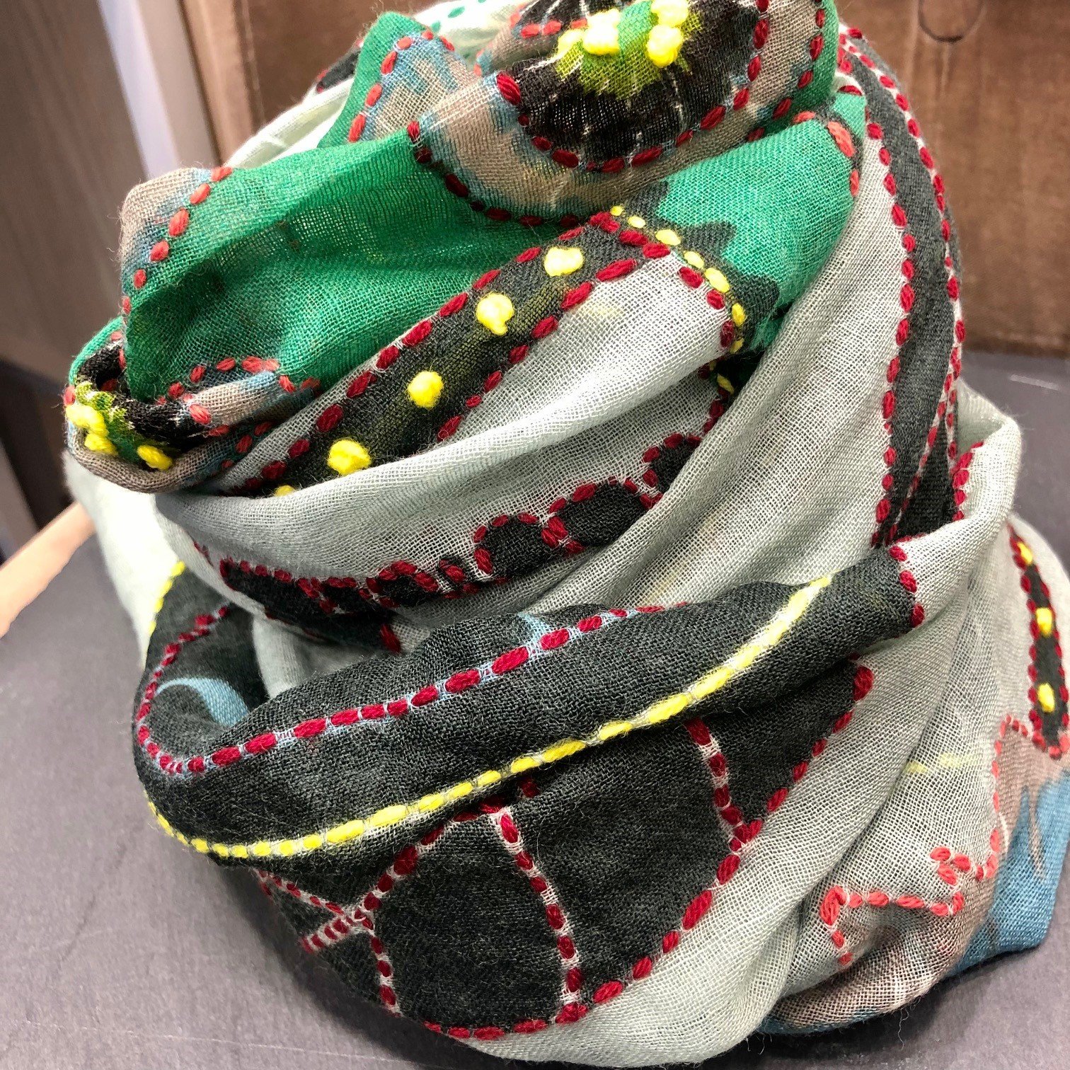 Echarpe AVA en laine avec broderie, motif fleurs des champs. Coloris vert d’eau,vert prairie et kaki, broderie jaune et rouge.