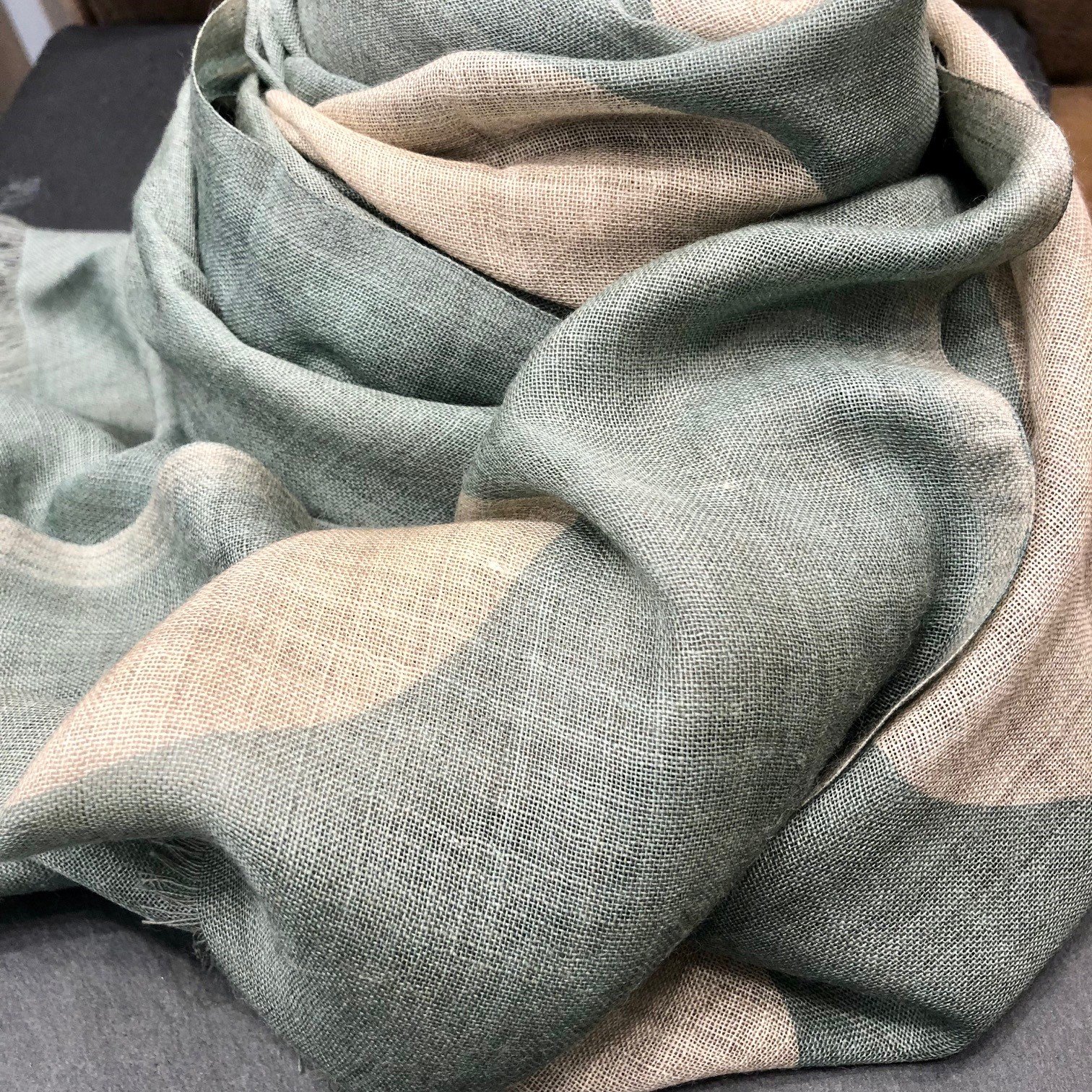 Echarpe FLAVY en laine et soie, gros pois beige coloris de fond vert d’eau.