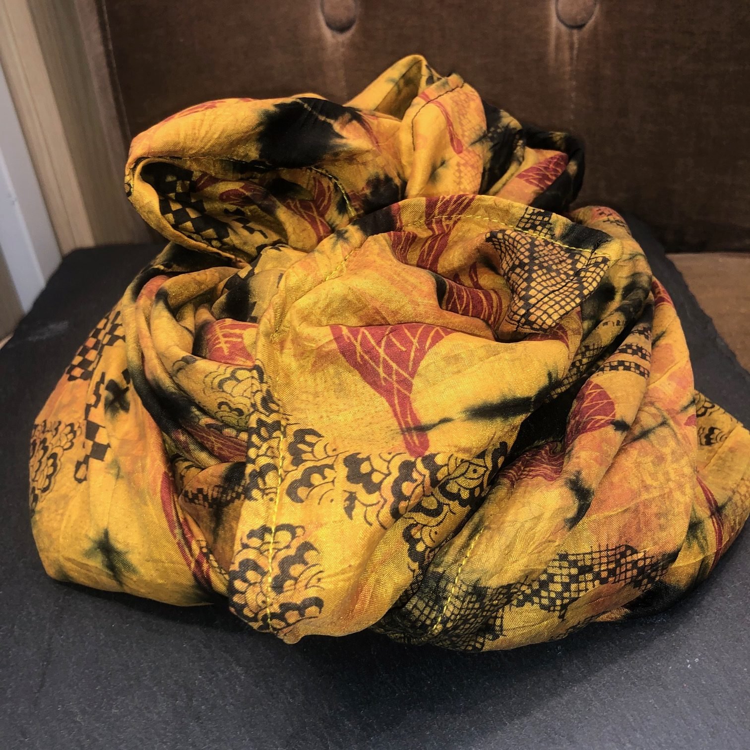 Foulard en sari indien vintage recyclé de soie tie and dye coloris safran/noir.