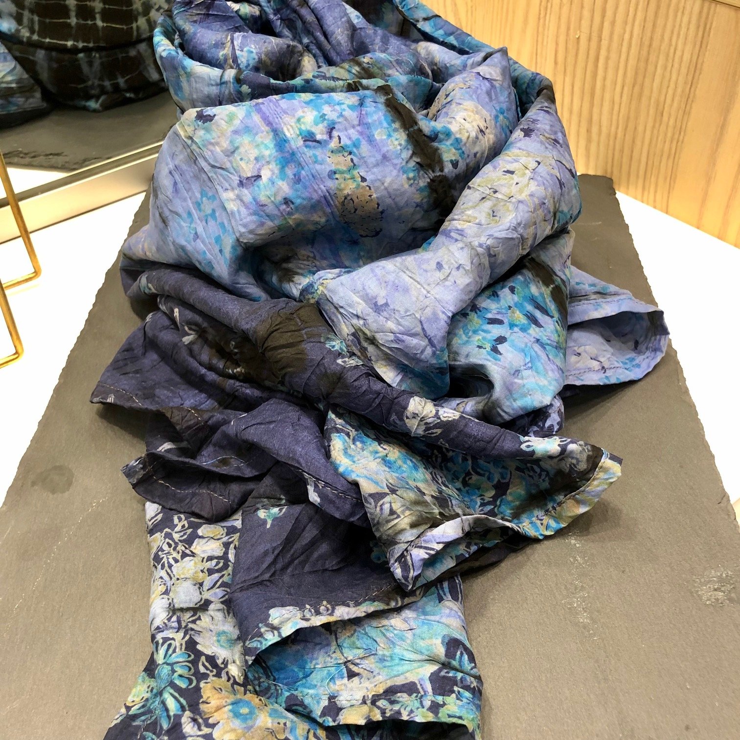 Foulard en sari indien vintage recyclé de soie tie and dye coloris bleu marine/lilas/turquoise/noir.