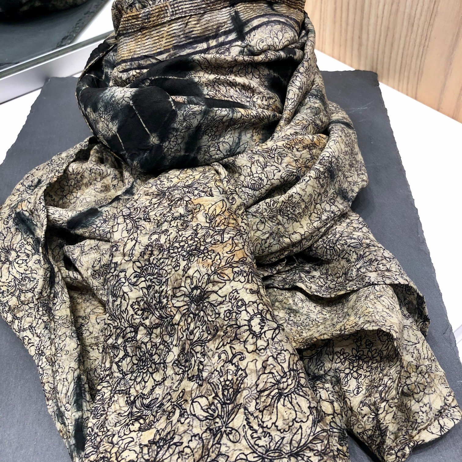 Foulard en sari indien vintage recyclé de soie tie and dye coloris beige/noir.