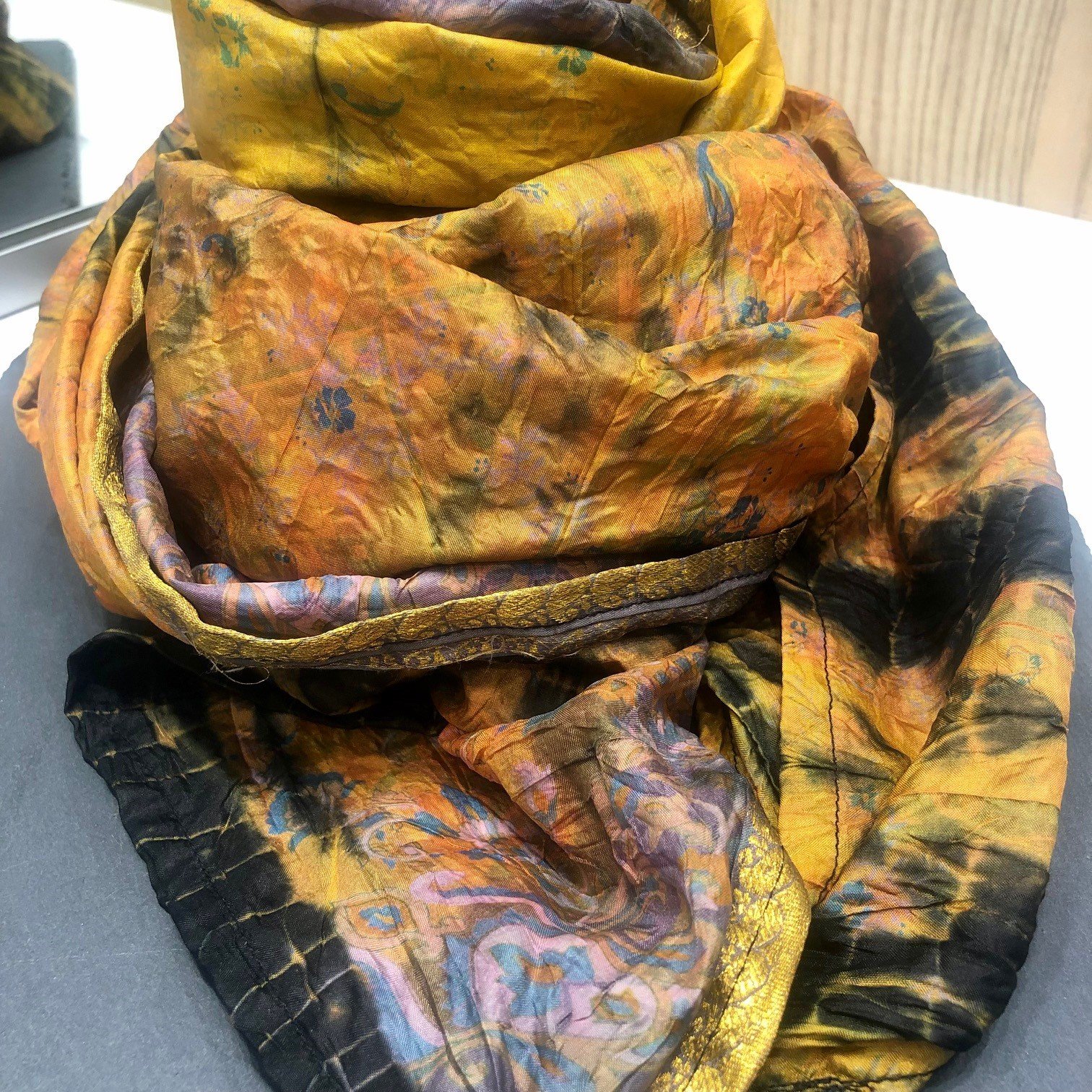 Foulard en sari indien vintage recyclé de soie tie and dye coloris safran orangé/noir