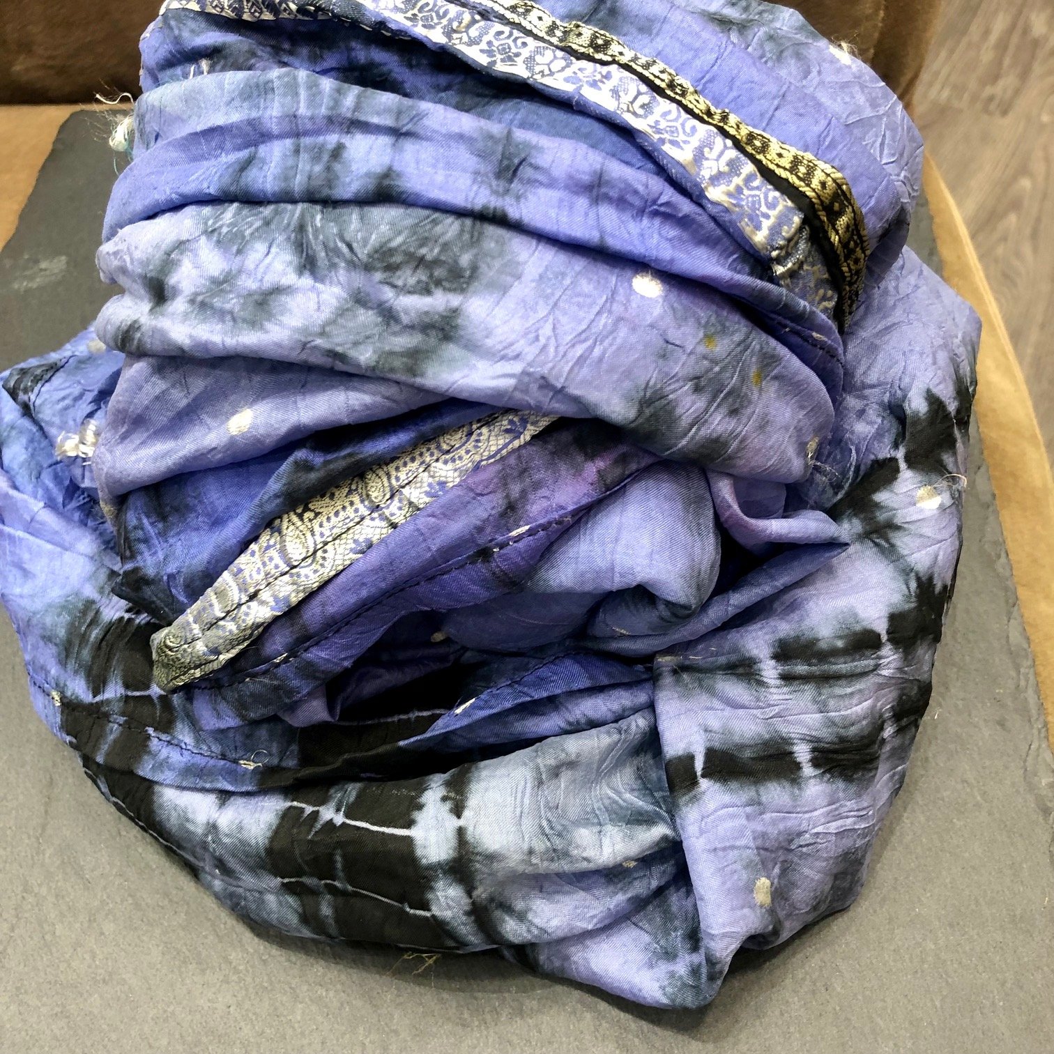 Foulard en sari indien vintage recyclé de soie tie and dye coloris parme/noir