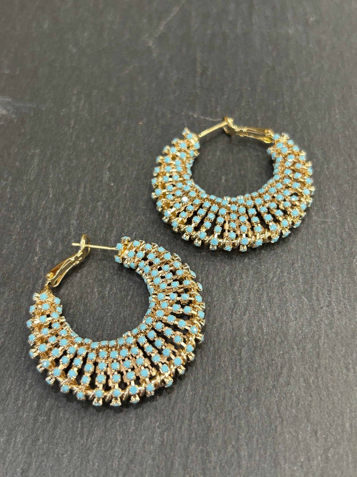 Boucles d’oreilles créoles en métal doré à l’or fin, emperlées de strass vieux bleu ciel.