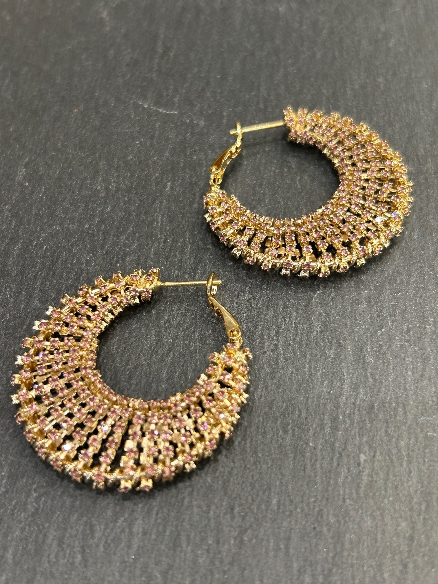 Boucles d’oreilles créoles en métal doré à l’or fin, emperlées de strass vieux rose.