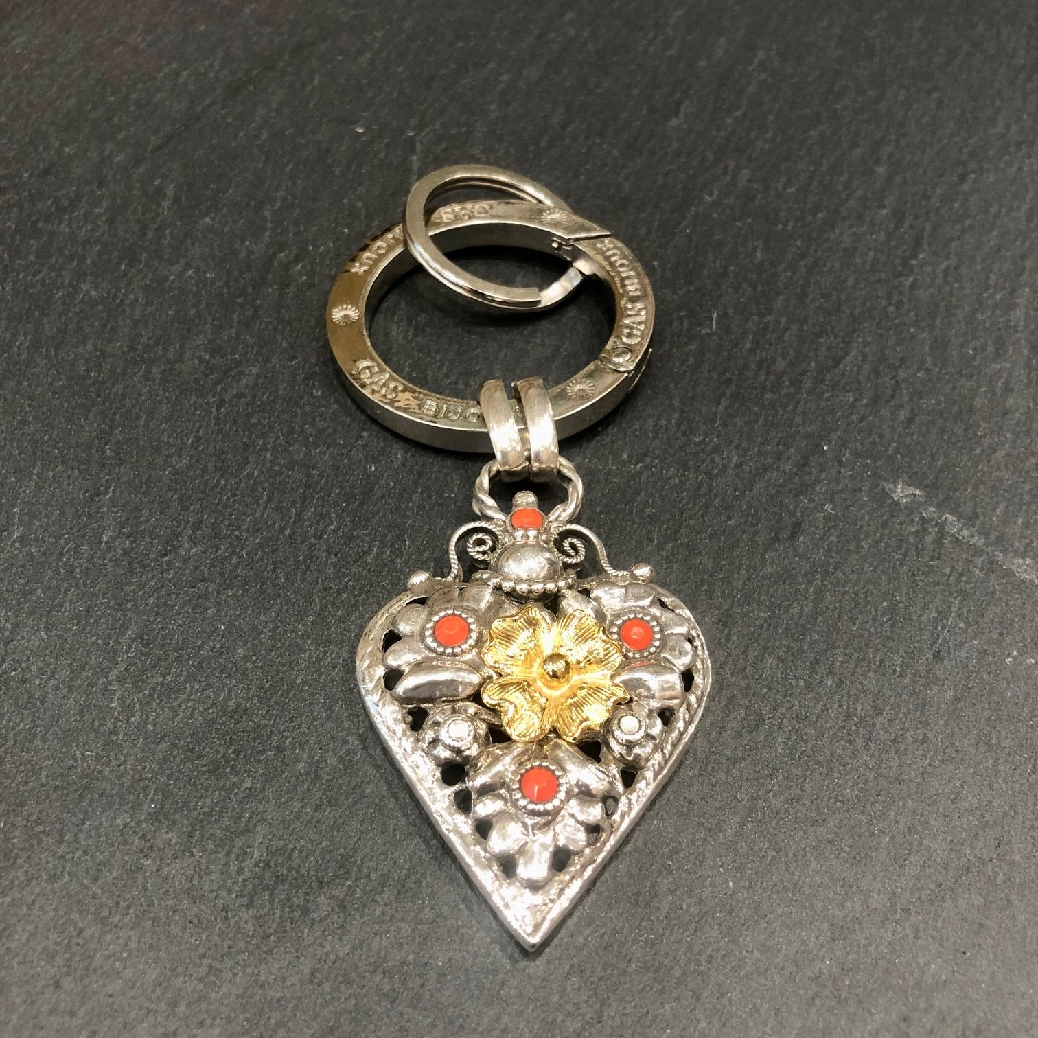 Porte clefs en métal argenté, en forme de coeur ajouré, décor floral orné de cabochons colorés.