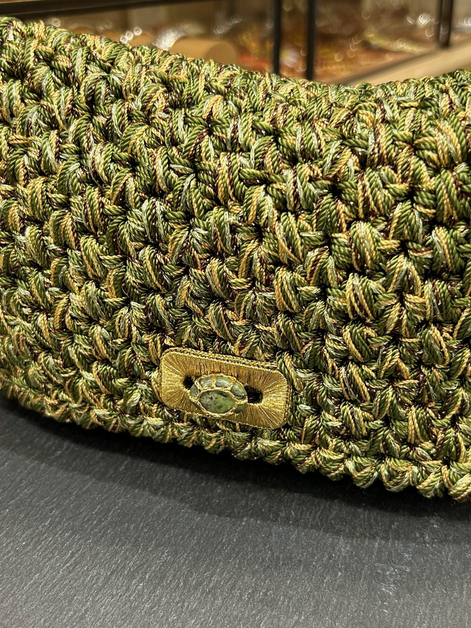 Sac en crochet réalisé avec des fils de coton, lurex, orné d’une pierre fine en cabochon, anse amovible que vous pouvez remplacer par une chaine pour le rendre plus habillé. Coloris anis. A porter épaule ou en bandoulière.